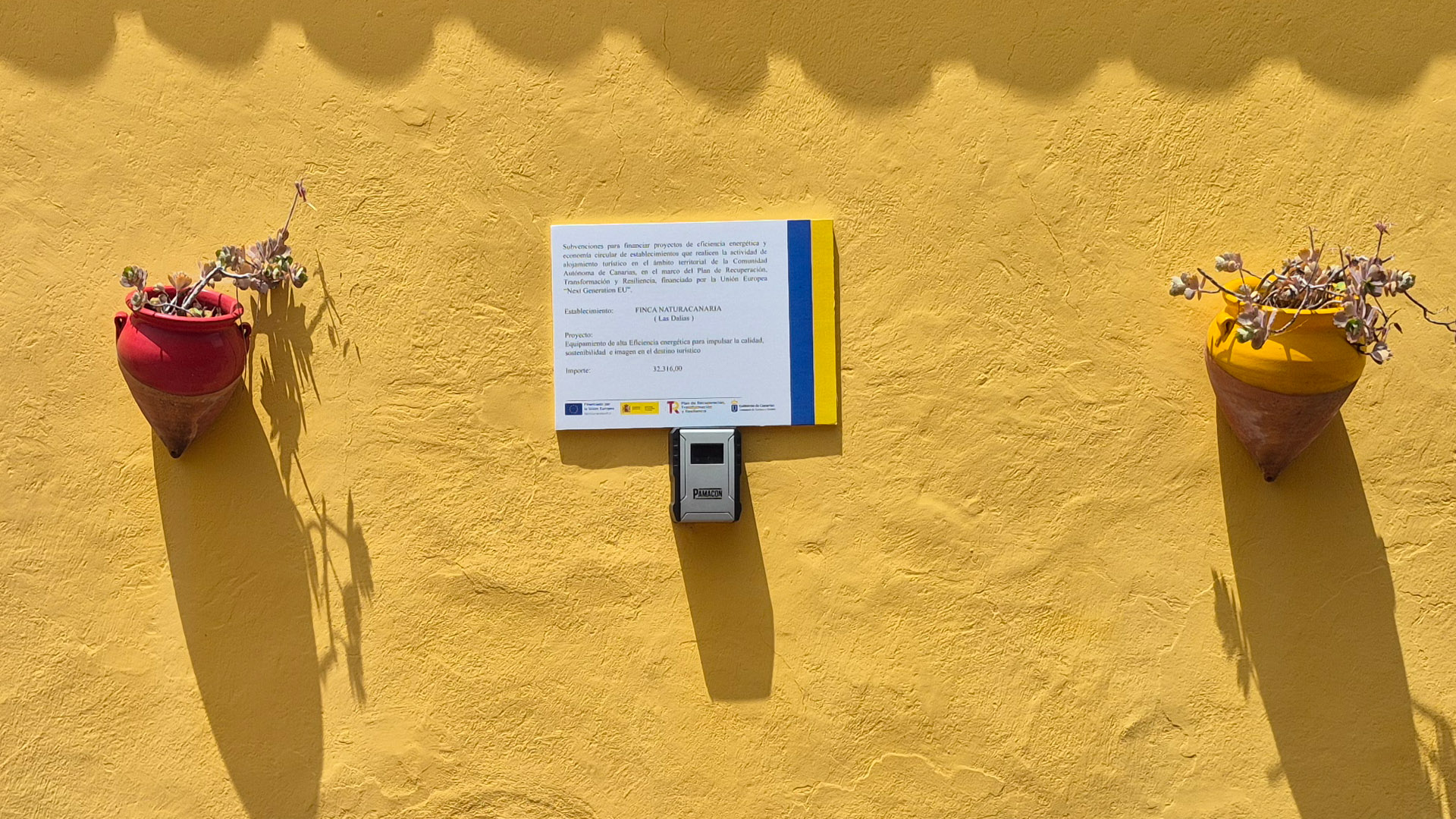 Casa subvencionada en la convocatoria aprobada por Orden 41/2025 financiándonos un proyecto de eficiencia energética y economía circular de establecimientos que realicen la actividad alojamiento turístico en el ámbito territorial de la Comunidad Autónoma de Canarias, en el marco del Plan de Recuperación, Transformación y Resiliencia. Proyecto: Equipamiento de alta eficiencia energética para impulsar la calidad, sostenibilidad e imagen en destino turístico. El mismo incluye Aerotermia, Fotovoltaica, Farolas y Frigorífico Clase A. Importe: 32.316,00 Euros Subvencionado por la Comunidad Europea – Next Generation EU.